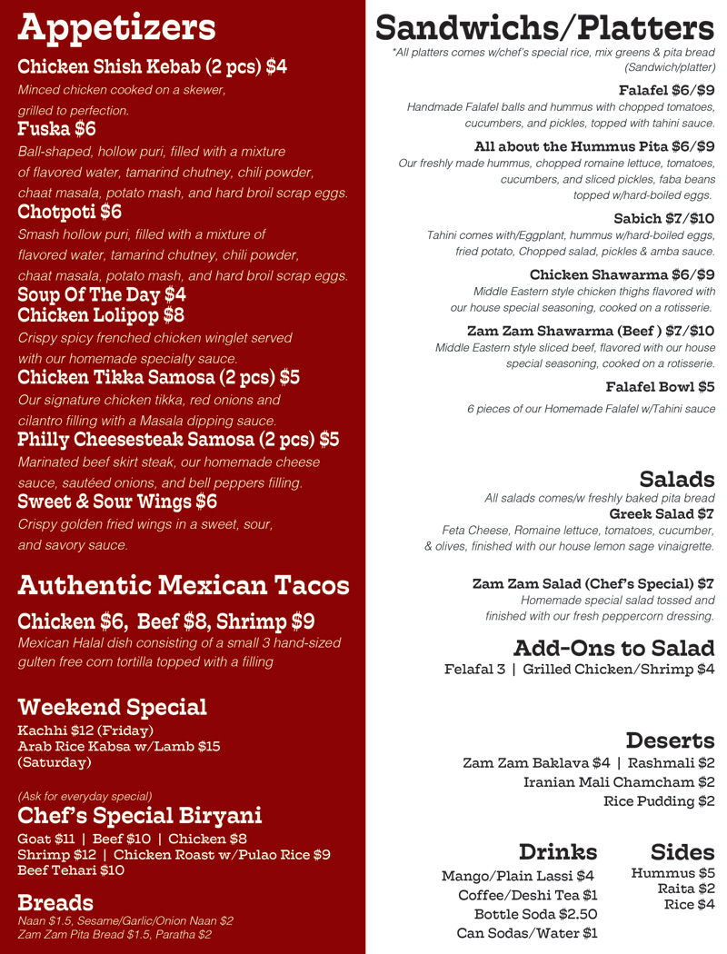 Our signature chicken tikka, red onions and cilantro filling with a Masala dipping sauce.