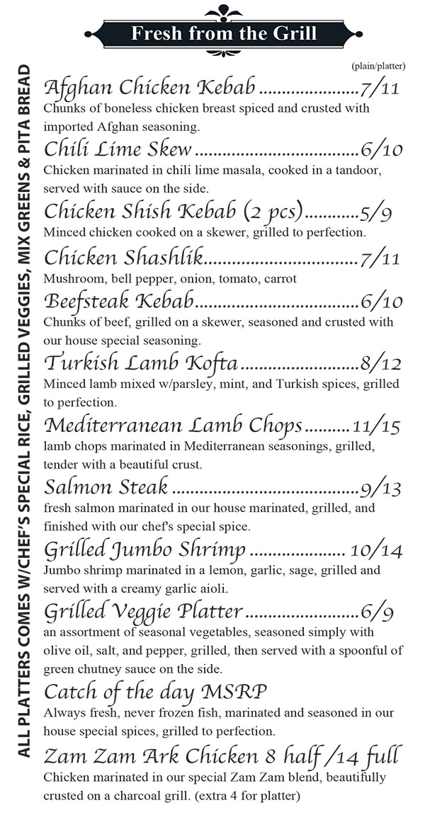 An assortment of seasonal vegetables, seasoned w/Olive oil, salt, and pepper, grilled served w/a spoonful of green chutney on the side.